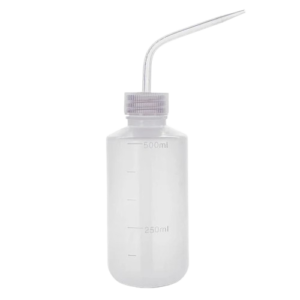 The wash bottle is a 250ml polyethylene squeeze bottle with a nozzle, which is used to rinse various pieces of laboratory glassware including test tubes and round bottom flasks. It is sealed with a screw-top lid and, when hand pressure is applied to the bottle, the liquid becomes pressurised and forced through the nozzle into a narrow stream of liquid.